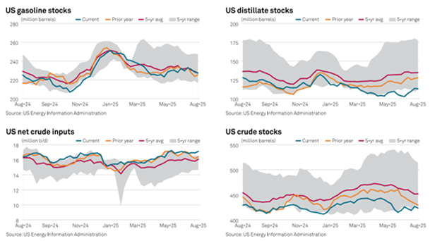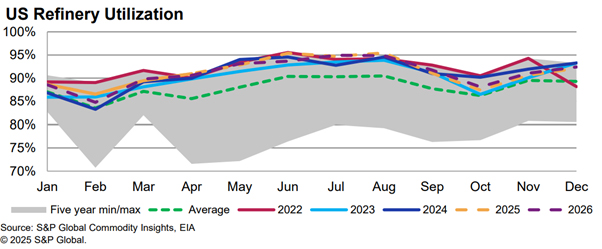 The Gulf Coast continues to lead in throughput, supported by strong diesel crack margins and minimal maintenance. On the West Coast, PBF’s Martinez refinery has ramped up to near full capacity, helping regional throughput reach 2.2 million b/d. However, the landscape is shifting. Valero’s Benicia refinery will close by April 2026, and Phillips 66’s Los Angeles refinery is set to shut down in late 2025. These closures are expected to tighten supply and increase reliance on imports, especially in California.