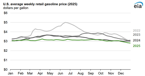 U.S. retail gasoline prices averaged $3.10 per gallon in 2025, down $0.21 from 2024, marking the third straight year of declines. The drop was primarily driven by lower crude oil prices caused by oversupply concerns and a weaker global economy early in the year. Prices peaked at $3.24 per gallon in April, before the summer driving season, and fell to an annual low of $2.81 per gallon in late December.