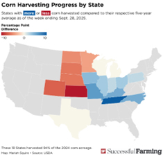 Harvest is progressing ahead of the five-year average across much of the Midwest. National corn production is forecast at 16.8 billion bushels from a record 98.7 million acres, with yields averaging 186.7 bu/acre. Soybeans are projected at 4.30 billion bushels, with a 53.5 bu/acre yield. As of late September, 18% of corn and 19% of soybeans were harvested nationally.