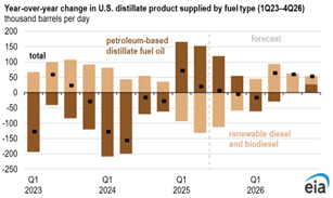 U.S. total distillate inventories are expected to end 2025 and 2026 at lower levels than previous years because of significant inventory draws in 2025, strong export demand, and domestic production declines stemming from refinery closures.