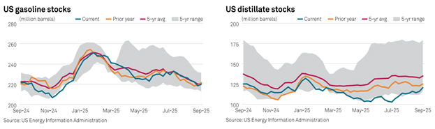 U.S. gasoline stocks drew throughout August, which reflected the demand related to the end of summer driving season. Regional inventories decreased near the end of August as the market approached the gasoline specification changes from Summer RVP (lower) to Winter RVP (higher). This is an annual seasonal shift, where regional inventories should recover once the transition is completed on September 15th.