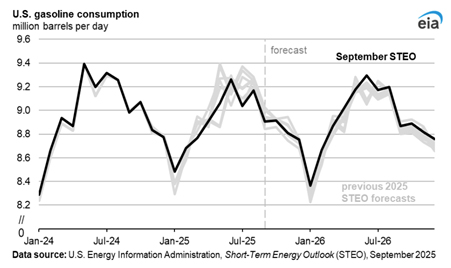 U.S. gasoline demand remained stable but below pre-pandemic levels, largely due to increased vehicle fuel efficiency and slower employment growth. Crude oil prices continued to fall, pushing average retail gasoline prices down to around $3.13 per gallon, a 7.6% year-over-year decline. Despite seasonal summer travel boosting consumption, refinery disruptions—particularly at BP’s Whiting facility—briefly constrained supply in the Midwest. Overall, the market continues to be shaped by steady demand, improving vehicle efficiency, and lower input costs, with supply volatility associated to regional events.