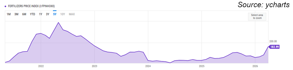 - Rising fertilizer costs and supply constraints threaten crop yields and tighter farmer margins.
